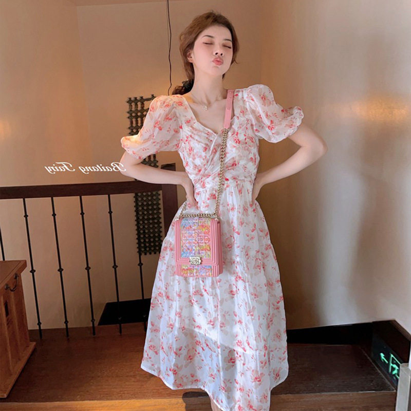 气质超仙印花小碎花连衣裙女2021夏季新款设计感温柔风中长款裙子热门设计联盟服务商