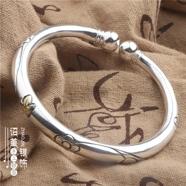 梅花原创设计999雪花足银彩色银杏叶清新复古国风图案纯银手镯女热门设计联盟服务商