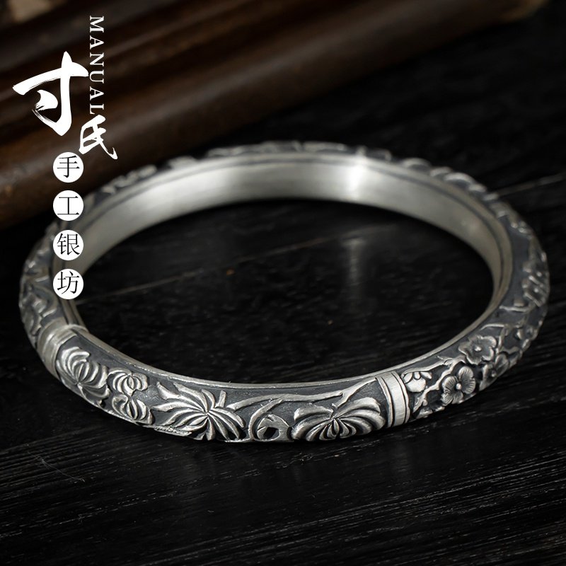 高档原创设计999足银手镯女时尚个性梅兰竹菊花银手镯女纯银年轻热门设计联盟服务商