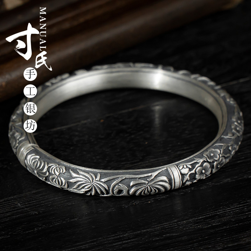 正品原创设计999足银手镯女时尚个性梅兰竹菊花银手镯女925年轻热门设计联盟服务商