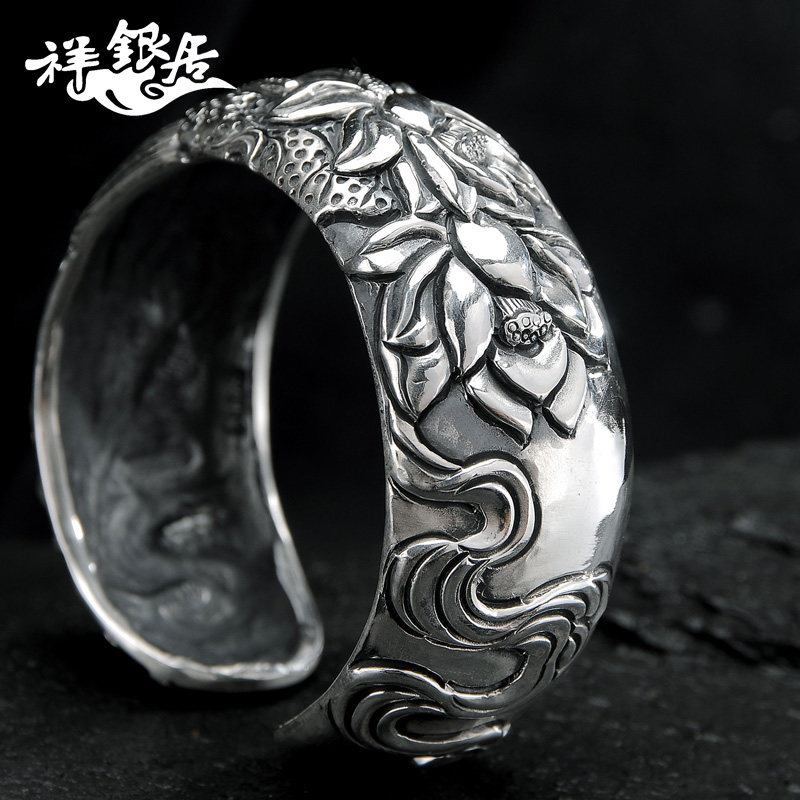 新祥银居原创设计 开口宽面复古999925手镯 浮雕荷花莲花足银手热门设计联盟服务商